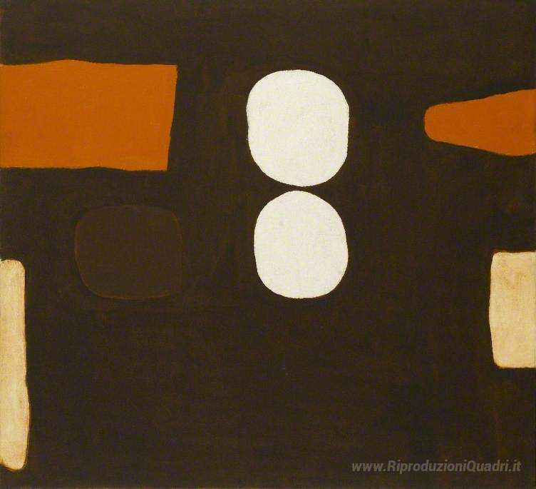 Ti offriamo una riproduzione artigianale su tela dell'opera famosa 'Marrone, arancio e bianco' di William Scott, dal Museo delle Riproduzioni.