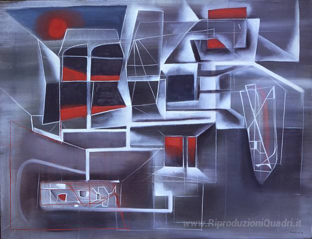 Ti offriamo una riproduzione artigianale su tela dell'opera famosa 'Notte Metropolitana' di Jimmy Ernst, dal Museo delle Riproduzioni.