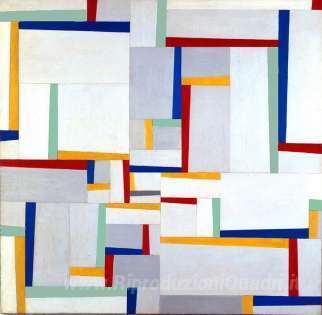 Ti offriamo una riproduzione artigianale su tela dell'opera famosa 'Relazionale Painting # 9' di Fritz Glarner, dal Museo delle Riproduzioni.