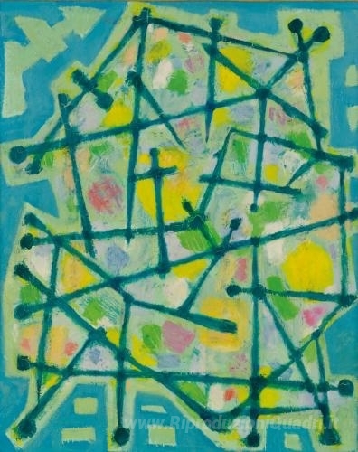 Ti offriamo una riproduzione artigianale su tela dell'opera famosa 'Righe blu-verdi su sfondo aqua' di Alfred Manessier, dal Museo delle Riproduzioni.