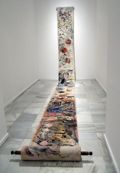 Ti offriamo una riproduzione artigianale su tela dell'opera famosa 'Rotolo di pittura industriale' di Giuseppe Pinot-Gallizio, dal Museo delle Riproduzioni.
