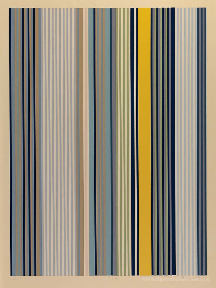 Ti offriamo una riproduzione artigianale su tela dell'opera famosa 'Segnale' di Gene Davis, dal Museo delle Riproduzioni.