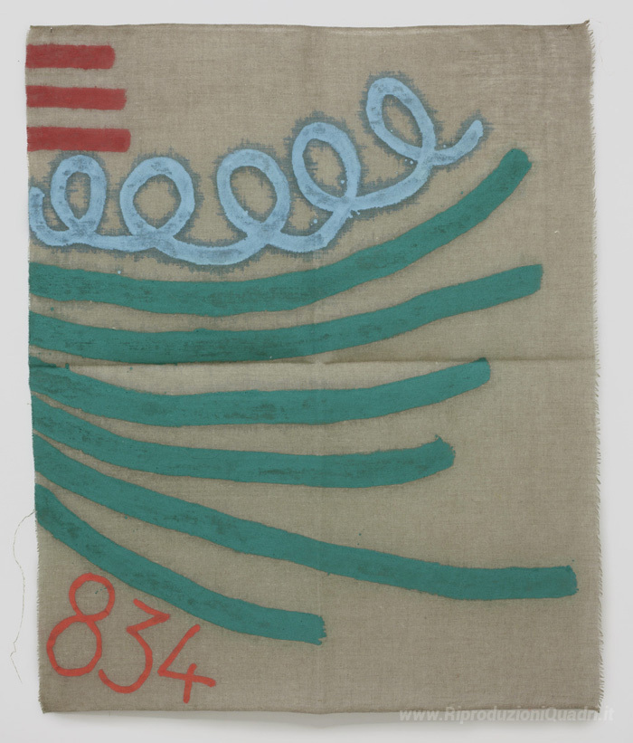Ti offriamo una riproduzione artigianale su tela dell'opera famosa 'Tre Linee con Arabesco n. 834' di Giorgio Griffa, dal Museo delle Riproduzioni.