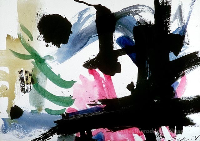 Ti offriamo una riproduzione artigianale su tela dell'opera famosa 'Tre Verdi e nero' di Jack Bush, dal Museo delle Riproduzioni.