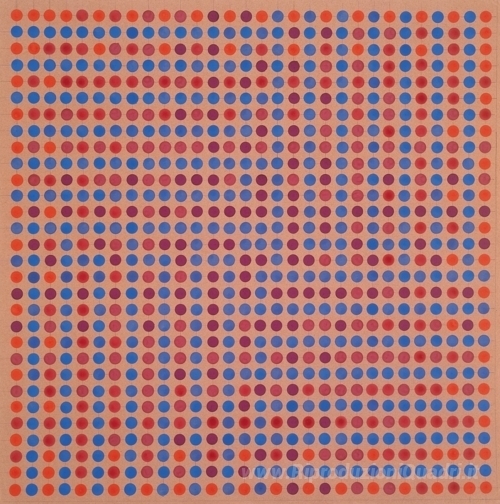 Ti offriamo una riproduzione artigianale su tela dell'opera famosa 'Vibrazioni des adjacents rouge-bleu, viola fond' di Horacio Garcia-Rossi, dal Museo delle Riproduzioni.