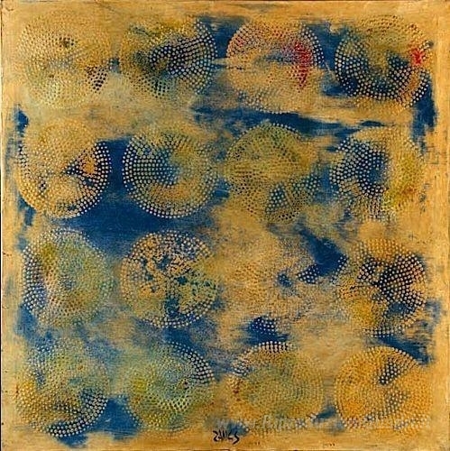 Ti offriamo una riproduzione artigianale su tela dell'opera famosa 'Yellow & Blue 16 Circles Multi-Dot' di Herbert Zangs, dal Museo delle Riproduzioni.