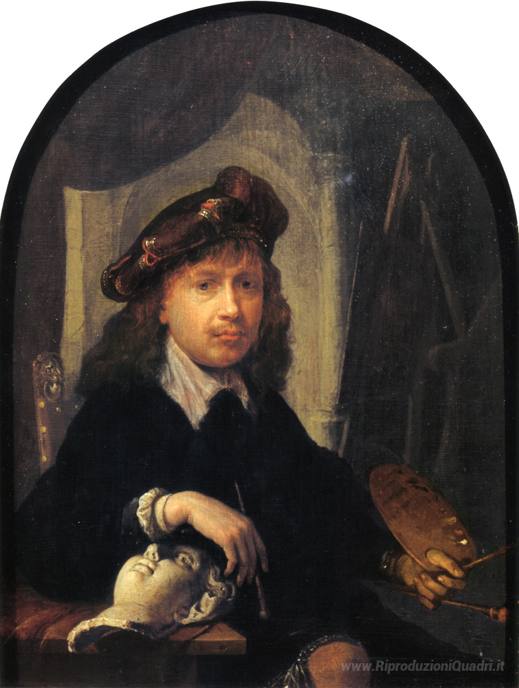 Ti offriamo una riproduzione artigianale su tela dell'opera famosa 'Auto ritratto' di Gerrit Dou, dal Museo delle Riproduzioni.