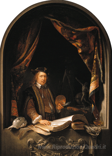 Ti offriamo una riproduzione artigianale su tela dell'opera famosa 'Auto ritratto' di Gerrit Dou, dal Museo delle Riproduzioni.