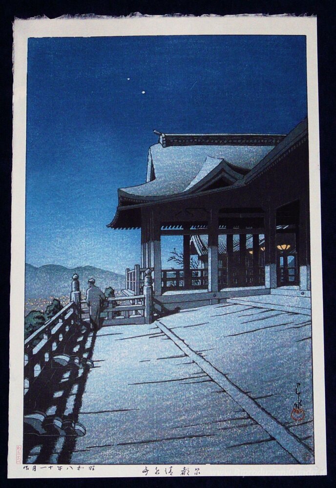 Ti offriamo una riproduzione artigianale su tela dell'opera famosa 'Autoritratto a Tempio di Kiyomizu, Kyoto' di Hasui Kawase, dal Museo delle Riproduzioni.