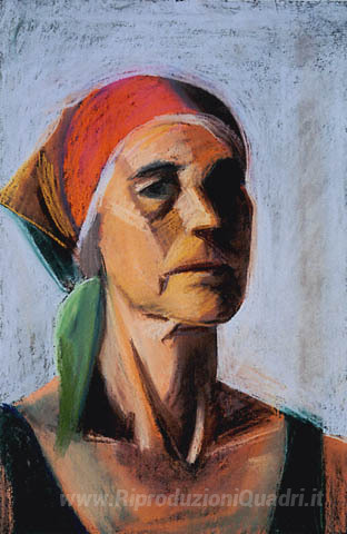 Ti offriamo una riproduzione artigianale su tela dell'opera famosa 'Autoritratto con Fazzoletto Rosso' di Louisa Matthiasdottir, dal Museo delle Riproduzioni.