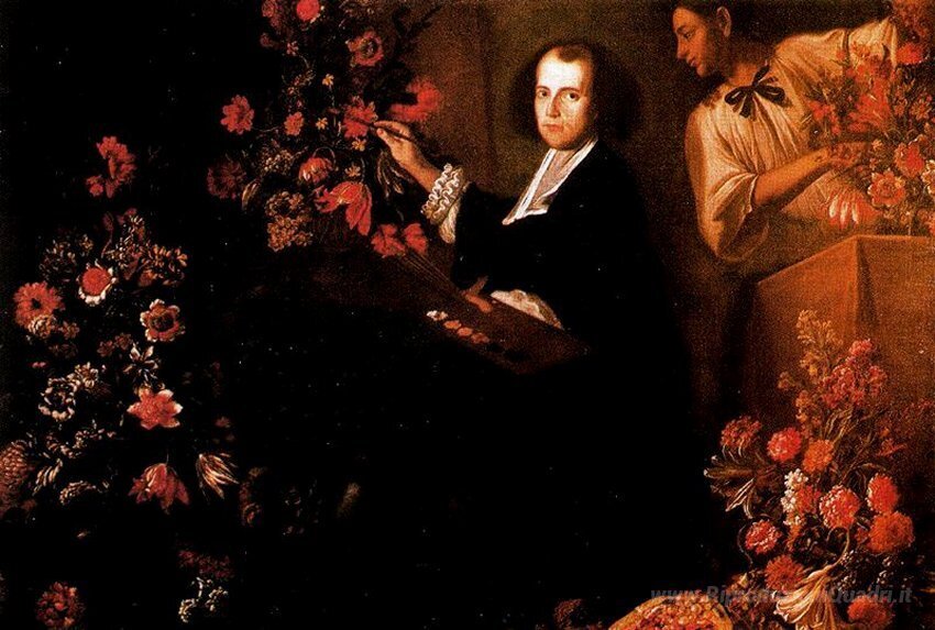 Ti offriamo una riproduzione artigianale su tela dell'opera famosa 'Autoritratto con i fiori' di Mario Nuzzi, dal Museo delle Riproduzioni.