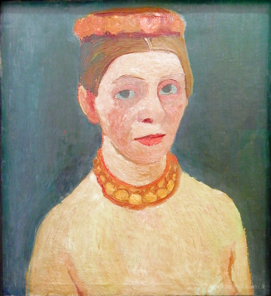 Ti offriamo una riproduzione artigianale su tela dell'opera famosa 'Autoritratto con il rosso corona di fiori e la catena' di Paula Modersohn-Becker, dal Museo delle Riproduzioni.