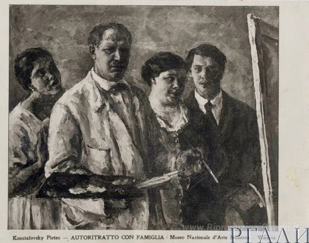 Ti offriamo una riproduzione artigianale su tela dell'opera famosa 'Autoritratto con la famiglia' di Pyotr Konchalovsky, dal Museo delle Riproduzioni.