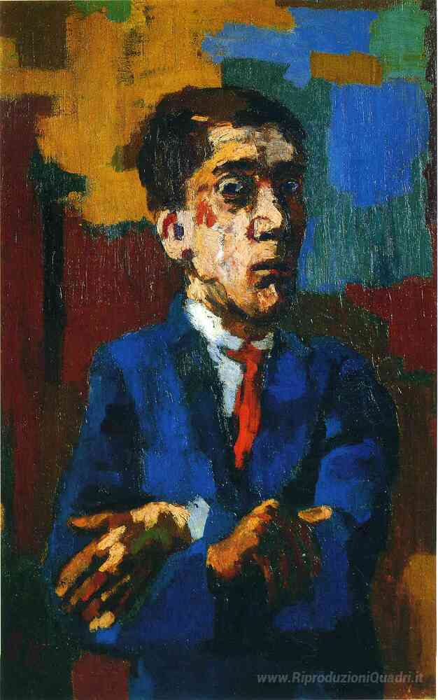 Ti offriamo una riproduzione artigianale su tela dell'opera famosa 'Autoritratto con le braccia incrociate' di Oskar Kokoschka, dal Museo delle Riproduzioni.