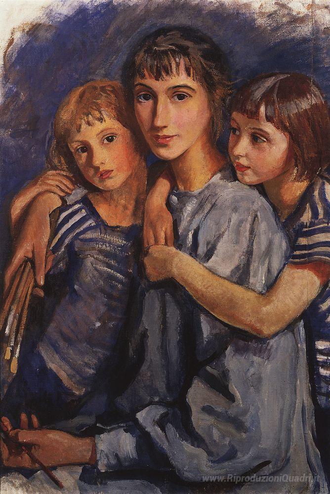 Ti offriamo una riproduzione artigianale su tela dell'opera famosa 'Autoritratto con le figlie' di Zinaida Serebriakova, dal Museo delle Riproduzioni.