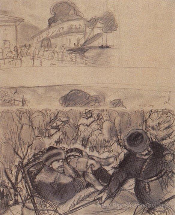 Ti offriamo una riproduzione artigianale su tela dell'opera famosa 'Autoritratto con moglie' di Boris Kustodiev, dal Museo delle Riproduzioni.
