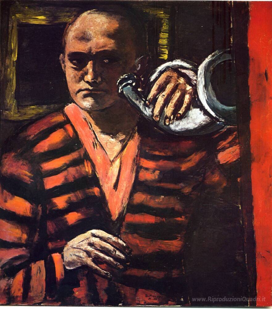 Ti offriamo una riproduzione artigianale su tela dell'opera famosa 'Autoritratto con tromba' di Max Beckmann, dal Museo delle Riproduzioni.