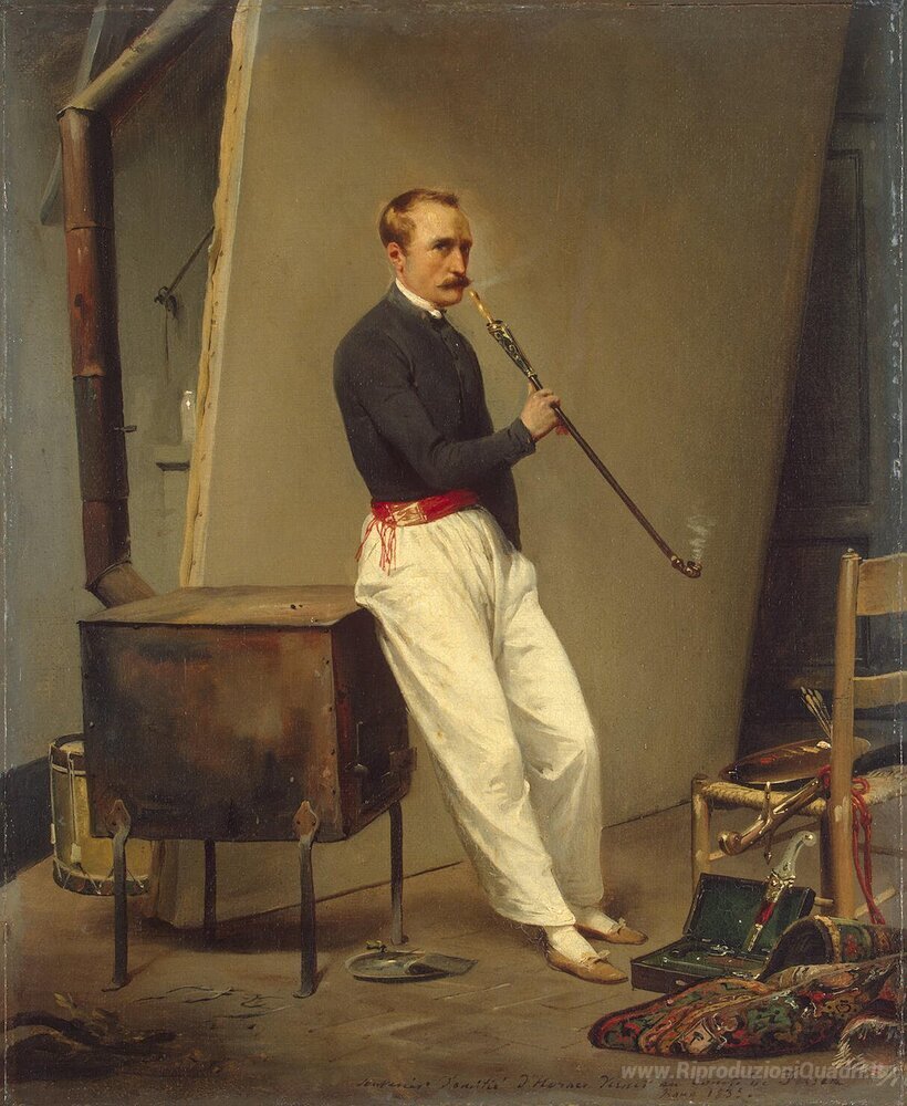 Ti offriamo una riproduzione artigianale su tela dell'opera famosa 'Autoritratto con tubo' di Horace Vernet, dal Museo delle Riproduzioni.
