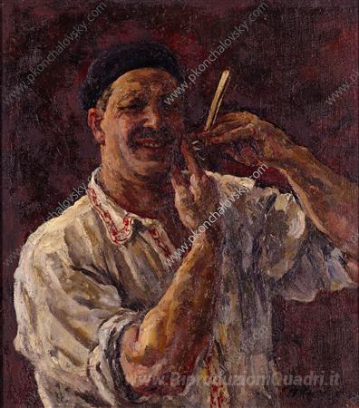 Ti offriamo una riproduzione artigianale su tela dell'opera famosa 'Autoritratto con un rasoio' di Pyotr Konchalovsky, dal Museo delle Riproduzioni.
