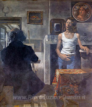 Ti offriamo una riproduzione artigianale su tela dell'opera famosa 'Autoritratto del pittore con il suo modello' di Yiannis Tsaroychis, dal Museo delle Riproduzioni.