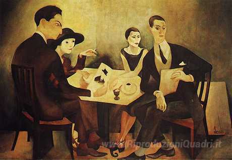 Ti offriamo una riproduzione artigianale su tela dell'opera famosa 'Autoritratto in un gruppo' di Jose de Almada-Negreiros, dal Museo delle Riproduzioni.