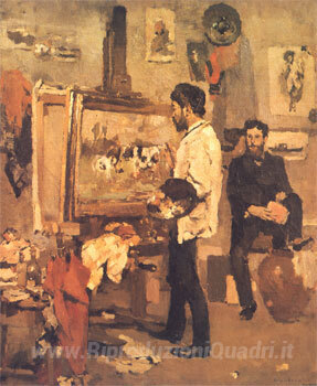 Ti offriamo una riproduzione artigianale su tela dell'opera famosa 'Columbano Bordalo Pinheiro in Atelier' di Columbano Bordalo Pinheiro, dal Museo delle Riproduzioni.