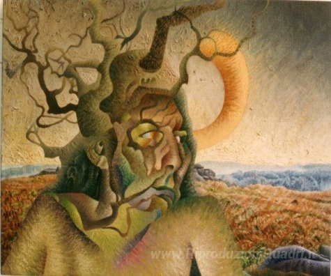 Ti offriamo una riproduzione artigianale su tela dell'opera famosa 'Ritratto dell'artista come Ent Warrior' di Godfrey Blow, dal Museo delle Riproduzioni.