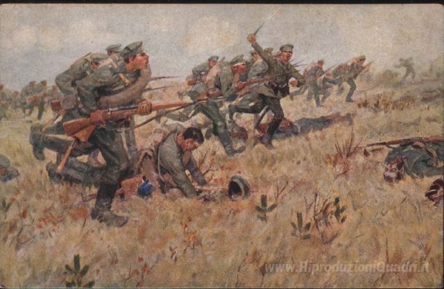 Ti offriamo una riproduzione artigianale su tela dell'opera famosa 'Contrattacco' di Ivan Vladimirov, dal Museo delle Riproduzioni.