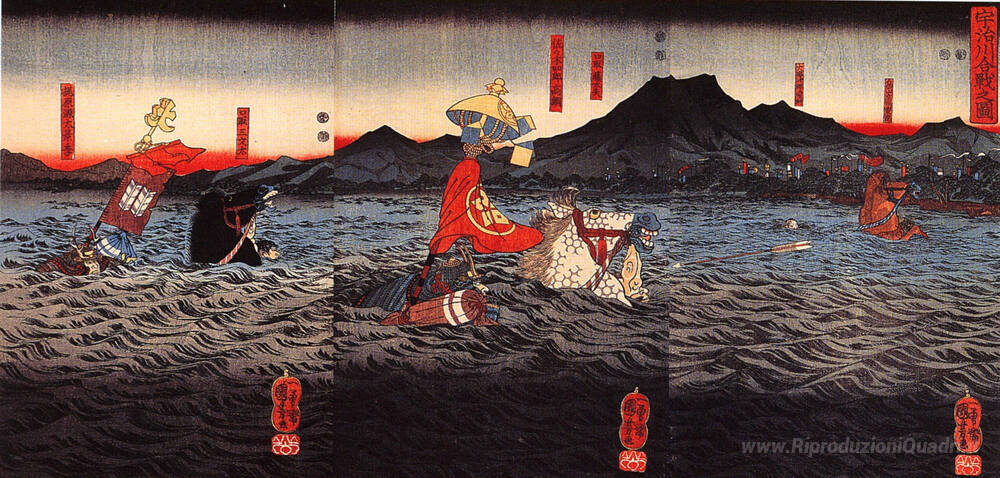 Ti offriamo una riproduzione artigianale su tela dell'opera famosa 'Kagesue, Takatsuna e Shigetada attraversando il fiume Uji' di Utagawa Kuniyoshi, dal Museo delle Riproduzioni.