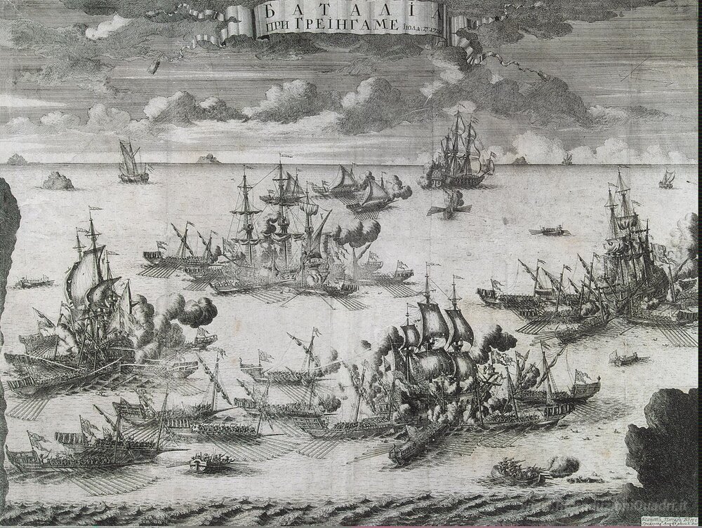 Ti offriamo una riproduzione artigianale su tela dell'opera famosa 'La battaglia di Grengam, 27 Giugno 1720' di Alexey Zubov, dal Museo delle Riproduzioni.