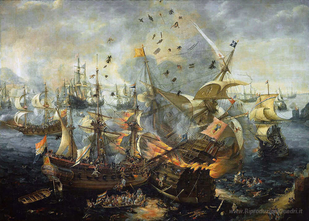Ti offriamo una riproduzione artigianale su tela dell'opera famosa 'L'esplosione della nave ammiraglia spagnola durante la Battaglia' di Hendrick Cornelisz Vroom, dal Museo delle Riproduzioni.