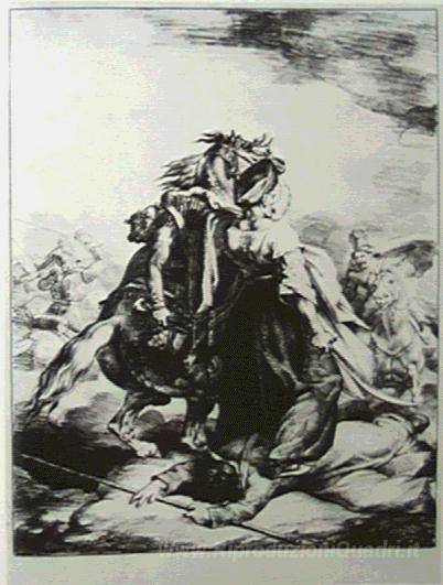 Ti offriamo una riproduzione artigianale su tela dell'opera famosa 'Mamelucco difendendo trumpete ferito' di Theodore Gericault, dal Museo delle Riproduzioni.