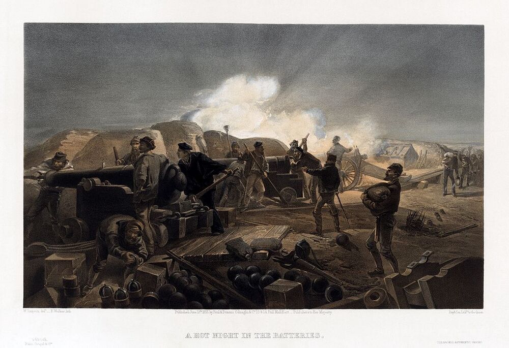 Ti offriamo una riproduzione artigianale su tela dell'opera famosa 'Serata molto calda nelle batterie' di William Simpson, dal Museo delle Riproduzioni.