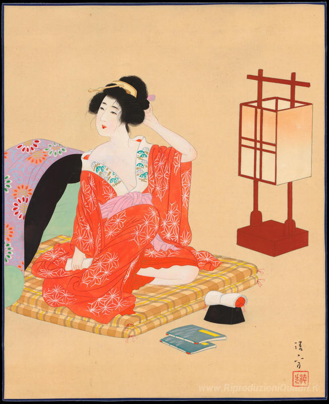Ti offriamo una riproduzione artigianale su tela dell'opera famosa 'Bijin Preparazione per Sleep' di Kiyokata Kaburagi, dal Museo delle Riproduzioni.