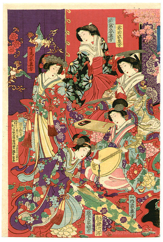 Ti offriamo una riproduzione artigianale su tela dell'opera famosa 'Elenco delle nobili' di Toyohara Chikanobu, dal Museo delle Riproduzioni.
