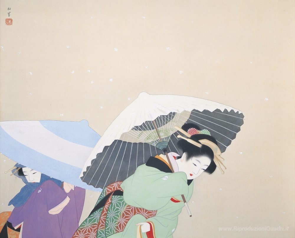 Ti offriamo una riproduzione artigianale su tela dell'opera famosa 'Fiocchi di neve' di Uemura Shoen, dal Museo delle Riproduzioni.