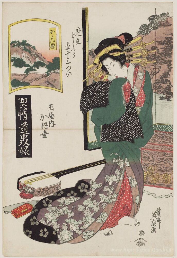 Ti offriamo una riproduzione artigianale su tela dell'opera famosa 'Kanbara: Kaoyo del Tamaya, dalla serie A Tokaido Gioco di cortig' di Keisai Eisen, dal Museo delle Riproduzioni.