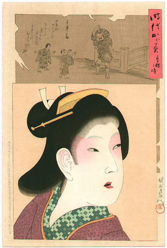 Ti offriamo una riproduzione artigianale su tela dell'opera famosa 'Kyouhou - Specchio of the Ages' di Toyohara Chikanobu, dal Museo delle Riproduzioni.