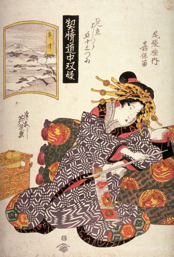 Ti offriamo una riproduzione artigianale su tela dell'opera famosa 'La cortigiana Kaoru di Owariya abbinato con Okitsu' di Keisai Eisen, dal Museo delle Riproduzioni.
