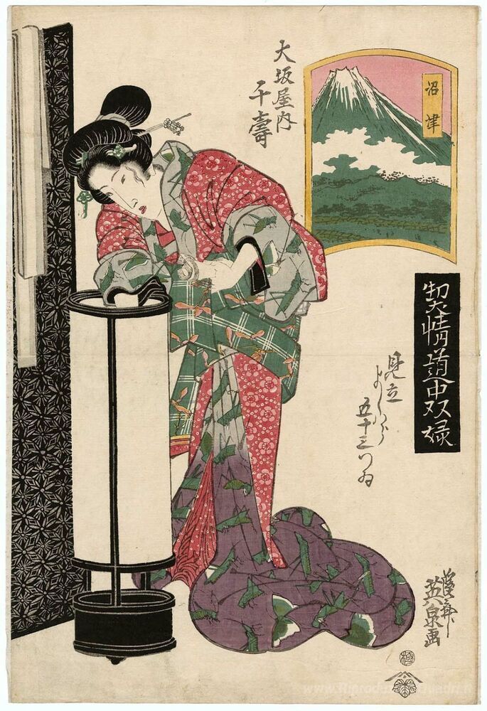 Ti offriamo una riproduzione artigianale su tela dell'opera famosa 'Numazu: Senju del Osakaya' di Keisai Eisen, dal Museo delle Riproduzioni.