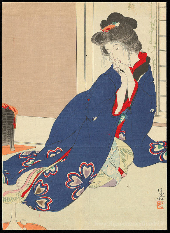 Ti offriamo una riproduzione artigianale su tela dell'opera famosa 'Scarlet Peach' di Kiyokata Kaburagi, dal Museo delle Riproduzioni.