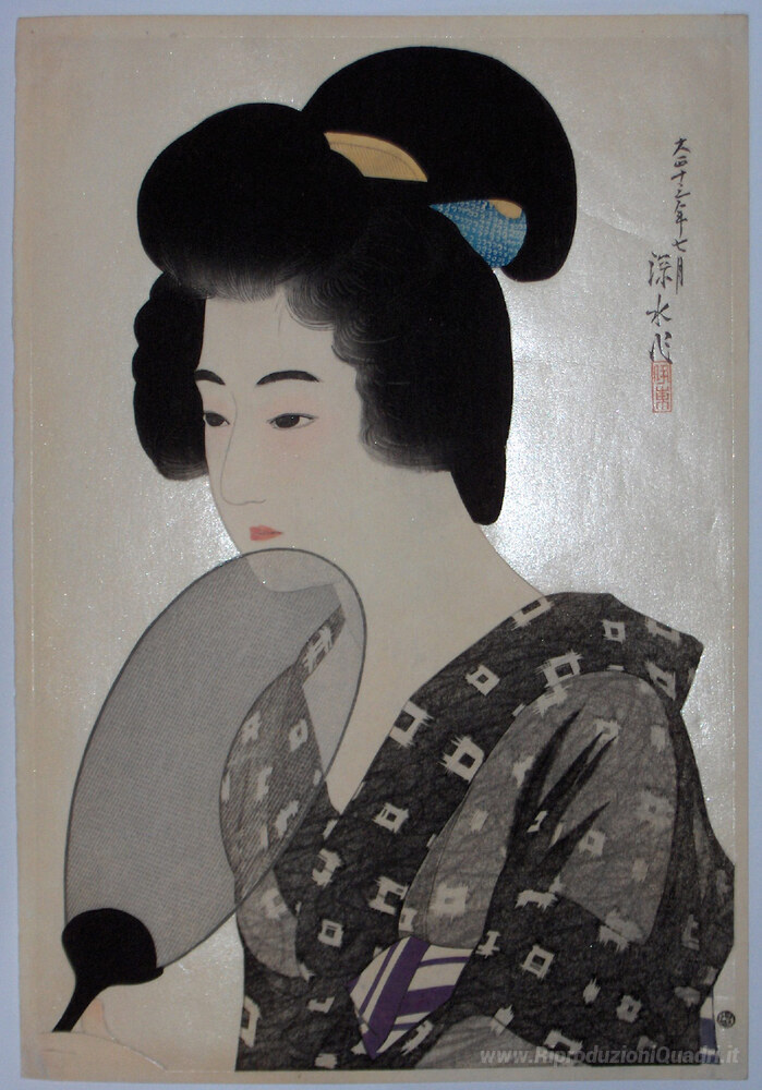 Ti offriamo una riproduzione artigianale su tela dell'opera famosa 'Una donna con un ventaglio' di Ito Shinsui, dal Museo delle Riproduzioni.