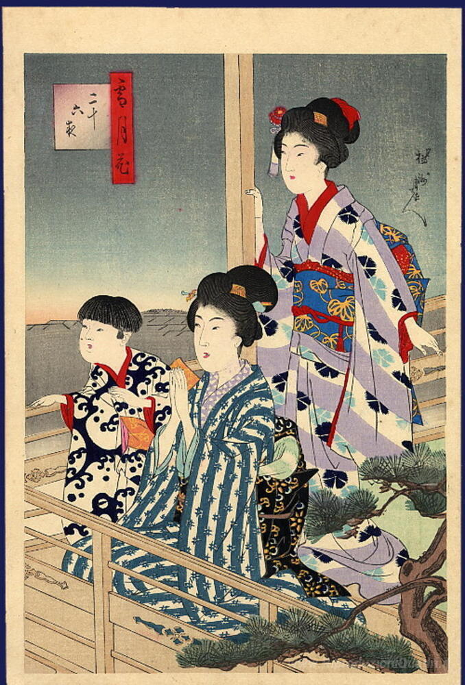 Ti offriamo una riproduzione artigianale su tela dell'opera famosa 'Visualizzazione da un balcone' di Toyohara Chikanobu, dal Museo delle Riproduzioni.