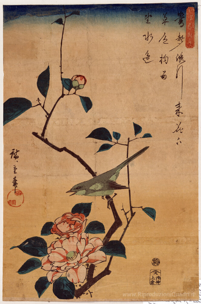 Ti offriamo una riproduzione artigianale su tela dell'opera famosa 'Camelia e Bush Warbler' di Hiroshige, dal Museo delle Riproduzioni.