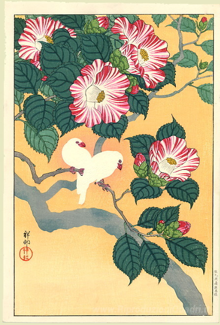 Ti offriamo una riproduzione artigianale su tela dell'opera famosa 'Camelia e riso Uccelli' di Ohara Koson, dal Museo delle Riproduzioni.