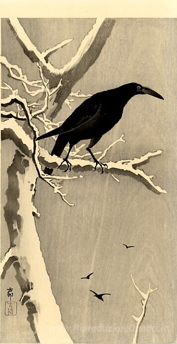 Ti offriamo una riproduzione artigianale su tela dell'opera famosa 'Corvo su un ramo nevoso' di Ohara Koson, dal Museo delle Riproduzioni.