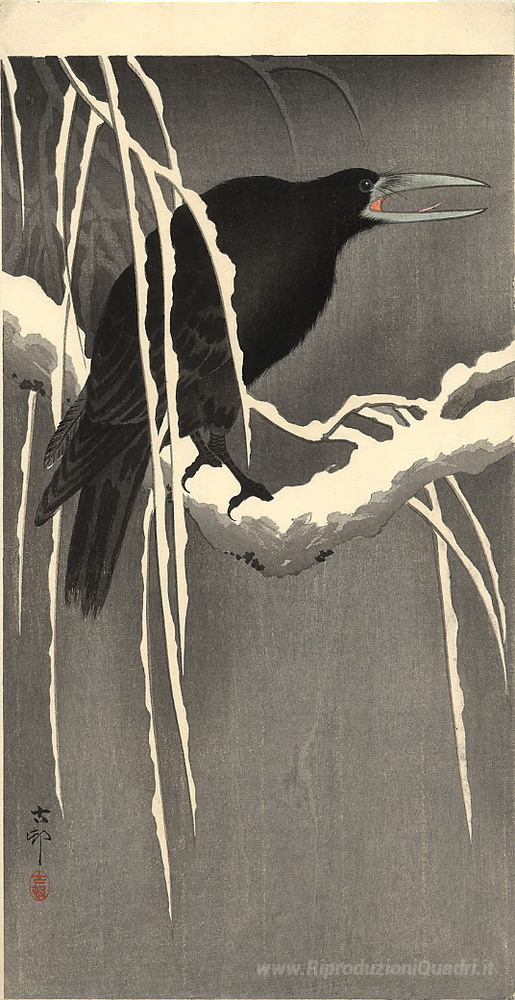 Ti offriamo una riproduzione artigianale su tela dell'opera famosa 'Corvo sul ramo nevoso' di Ohara Koson, dal Museo delle Riproduzioni.