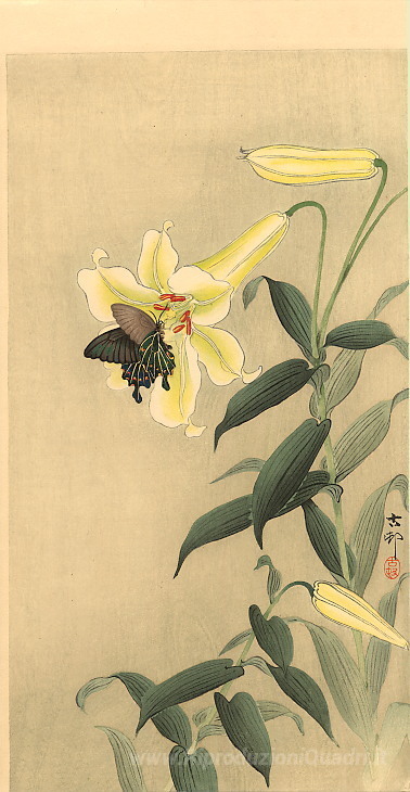 Ti offriamo una riproduzione artigianale su tela dell'opera famosa 'Farfalla e giglio' di Ohara Koson, dal Museo delle Riproduzioni.