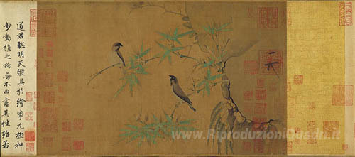 Ti offriamo una riproduzione artigianale su tela dell'opera famosa 'Fringuelli e bambù' di Emperor Huizong, dal Museo delle Riproduzioni.