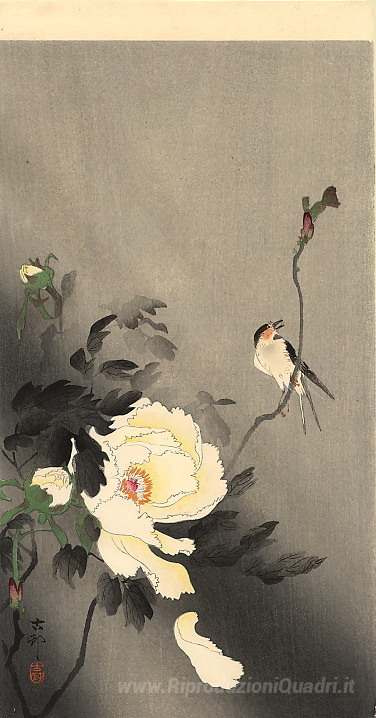 Ti offriamo una riproduzione artigianale su tela dell'opera famosa 'Ingoiare con Peony' di Ohara Koson, dal Museo delle Riproduzioni.